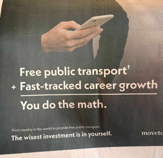 Post-election, here is an interview with Sasha Linden Cohen on the show Background Briefing. Among other things, we talk about the politics and economics of free (and fast!) buses. Perhaps the key point to make there is that this is a more common policy than you might think. For example, here (via Doug Henwood) is an ad in the Financial Timesfrom the government of Luxembourg, touting their free transit system.