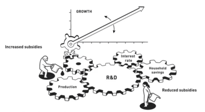 Also from mid-October, is a podcast interview with the Swedish researcher Max Jerneck (there’s a brief introduction in Swedish, which you can skip unless you happen to speak it.). It’s a long conversation, which covers a lot of ground: the first 50 minutes are on Zohran, then there’s 10 or 15 minutes on Trumpism, and the last 20 minutes or so are about Against Money. This was a nice combination from my point of view, since it was an opportunity to try to link the arguments in the book, which are mostly at a fairly abstract level, with more immediate political questions. There’s also a YouTube version, if you want to see me gesticulating; if I’d known he was posting the video, I would have cleaned up my home office first. The YouTube version also lets you see this funny picture Max pulled from the Nobel Prize Committee’s writeup of this year’s winners, which makes “household savings” literally the driving motor of growth — a nice example of the conceptual framework that the book is trying to help free us from.